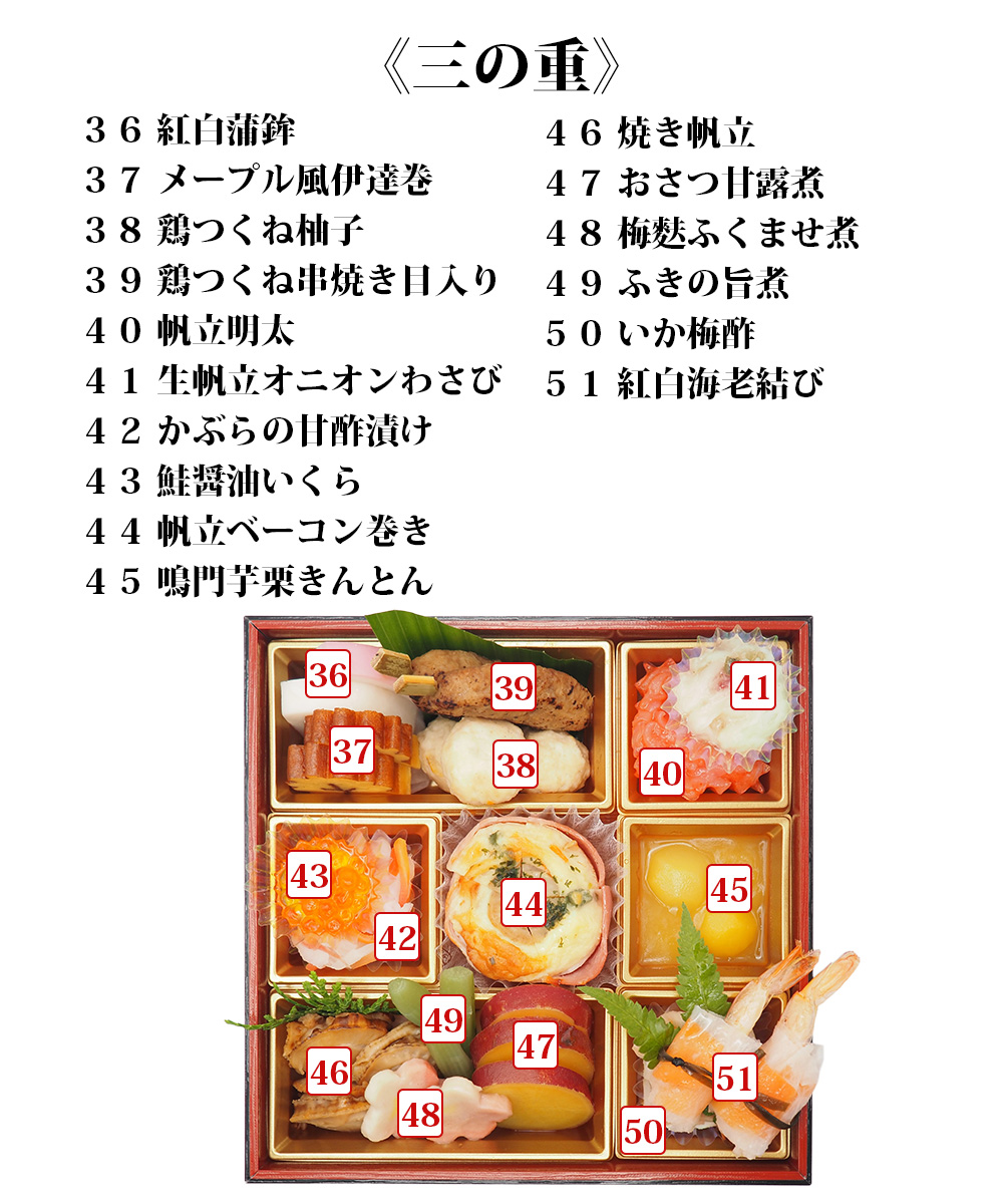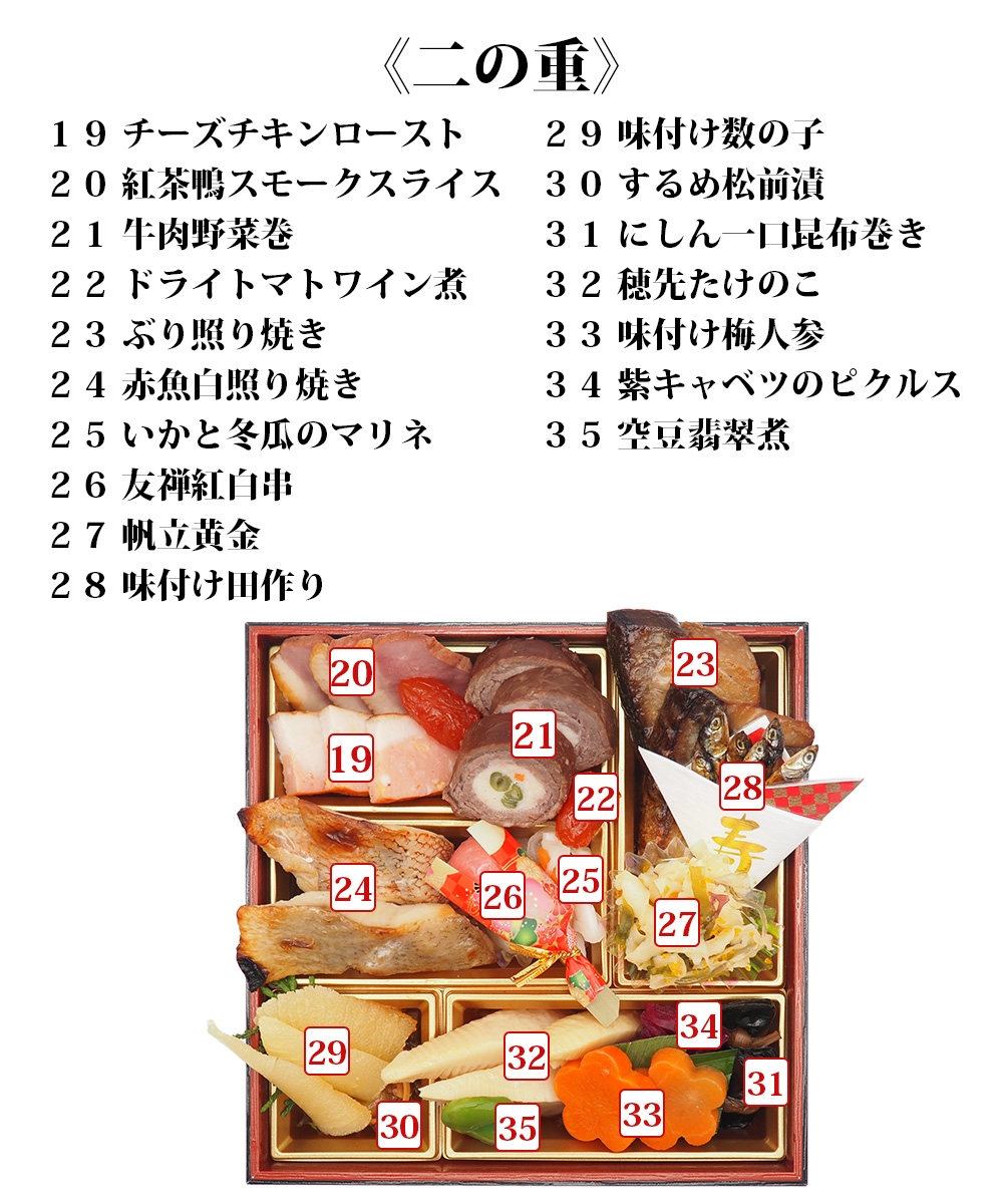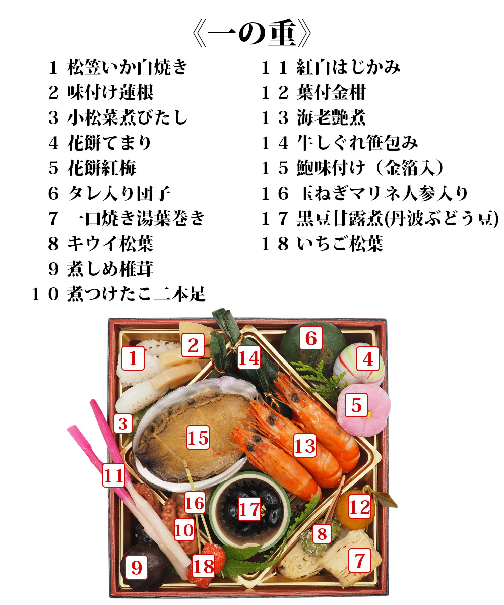 大ぶりの鮑、海老、たこなどの高級和食材に加え、お子様にもお楽しみいただける洋風食材も取り揃えています。これぞ正月のごちそう!豪華盛りだくさんの祝膳です。