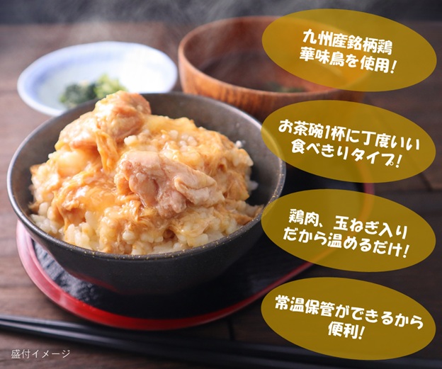 九州産銘柄鶏「華味鳥」を使用し、鶏だし仕立ての上品な味わいに仕上がっています。電子レンジ、湯せんで温めてご飯に乗せるだけでお召し上がりいただけます。温めるだけの手軽さと常温保管も出来るので小腹がすいた時に重宝します。