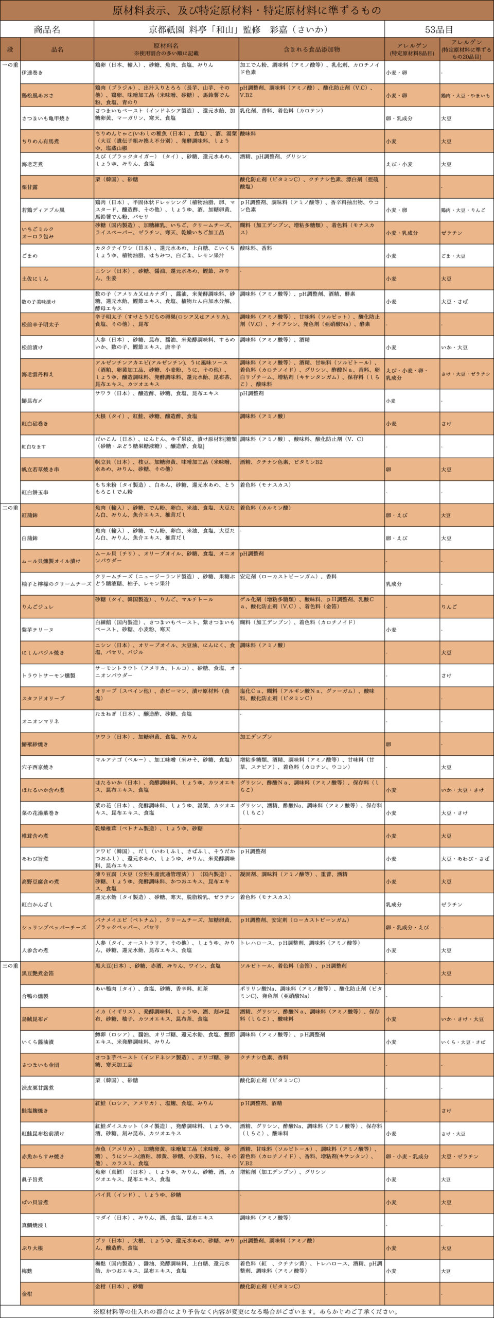 京都祇園創作割烹「和山」監修 彩嘉 原材料表示及びアレルゲン一覧表
